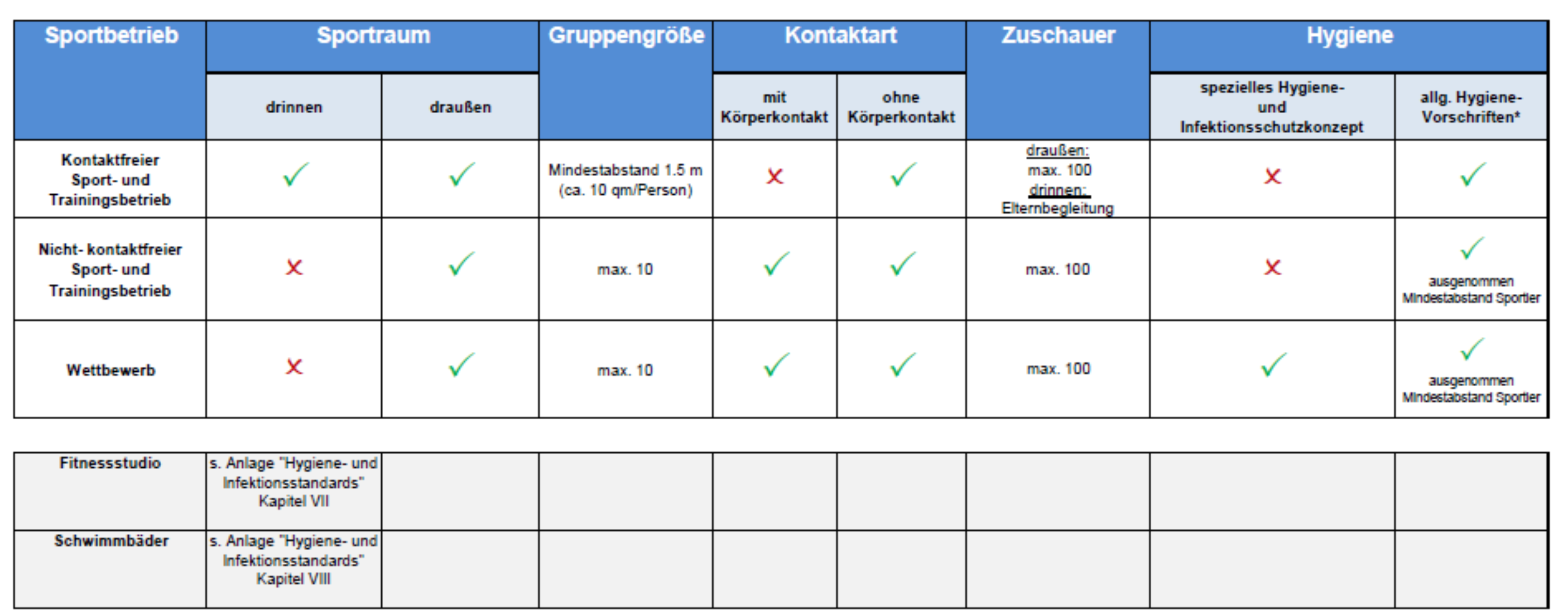 – sind sportliche Wettbewerbe mit bis zu 10 Personen in geschlossenen Räumen und Hallen wieder zulässig (Achtung: Hygiene- und Infektionsschutzkonzepte erforderlich! Rückverfolgbarkeit sicherstellen!),